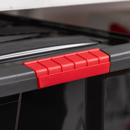 40 Qt. Plastic Storage Bin Tote Organizing Container with Durable Lid and Secure Latching Buckles, Stackable and Nestable, 4 Pack, Black with Red Buckles