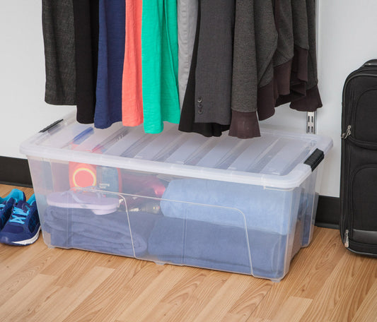 84 Qt. Plastic Storage Bin Tote Organizing Container with Durable Lid and Secure Latching Buckles, Stackable and Nestable, 2 Pack, clear with Black Buckles