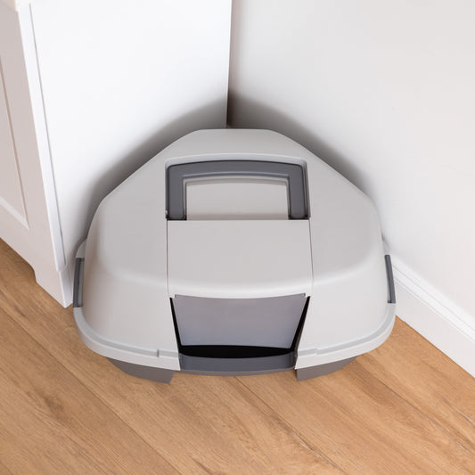 Grand bac à litière d'angle à capuchon avec pelle, gris